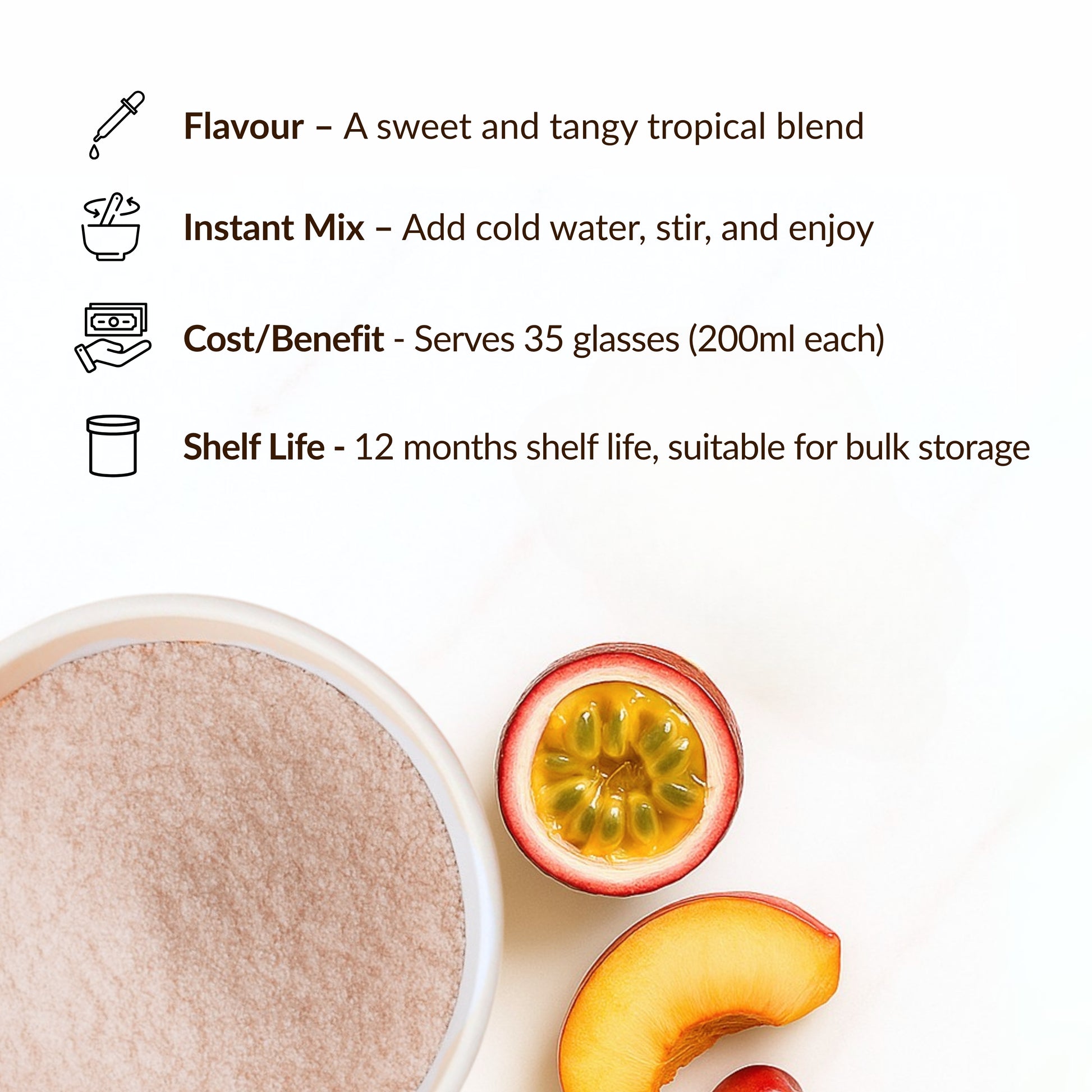 - Easy to Prepare: Add 2 teaspoons (approx. 9g) of premix to a glass. Pour in 100ml cold water. Stir until dissolved. Add ice cubes and enjoy.