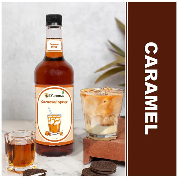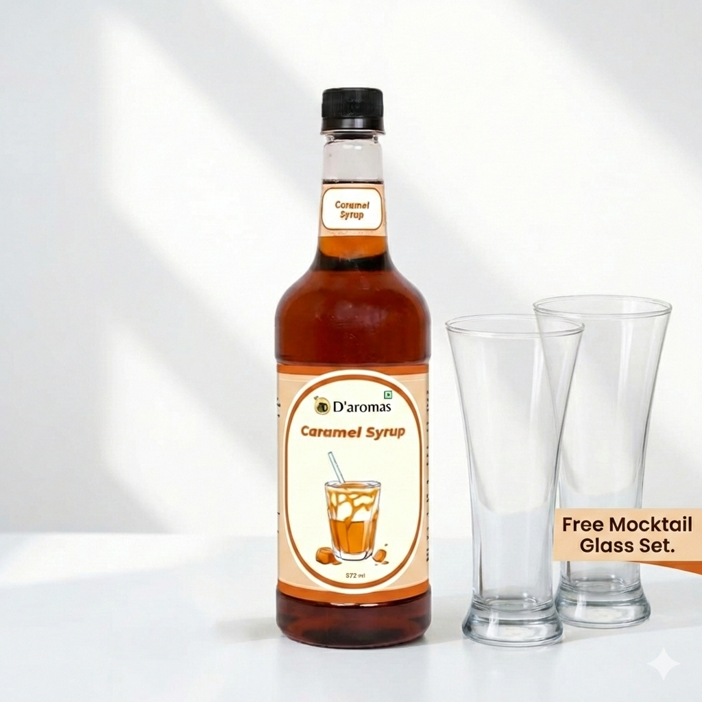 Premium Caramel Flavoured Syrup – Rich, buttery caramel taste perfect for coffees, mocktails, cocktails, milkshakes, desserts, and toppings.